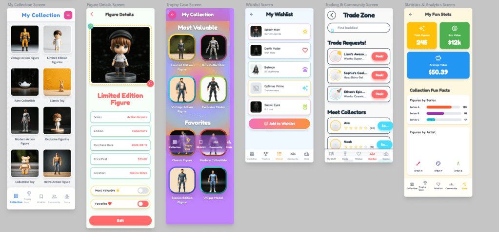 1). The AI-generated design that I created was an app that allows for toy collectors and enthusiasts to display, track, and trade their figures and collectibles.
