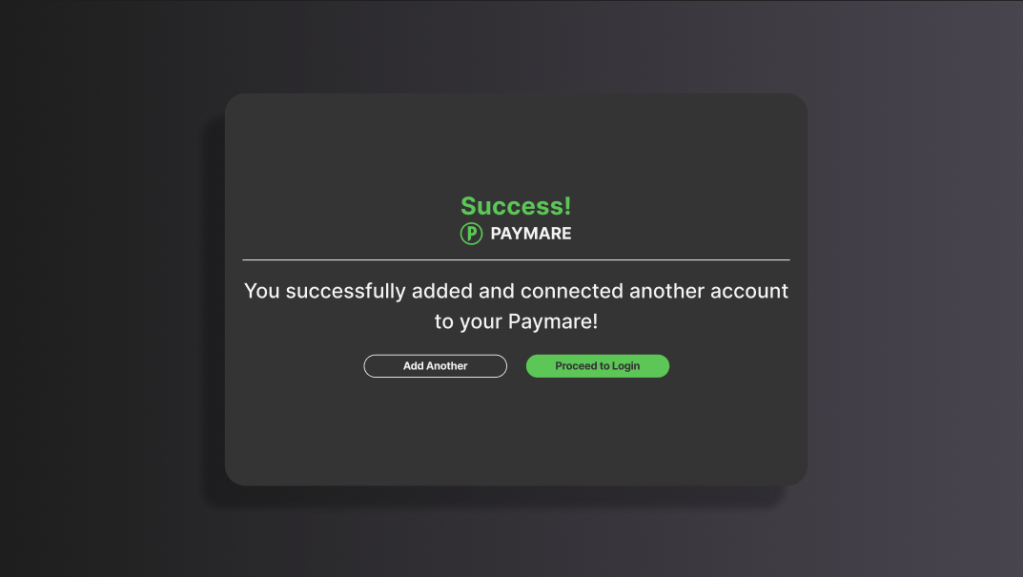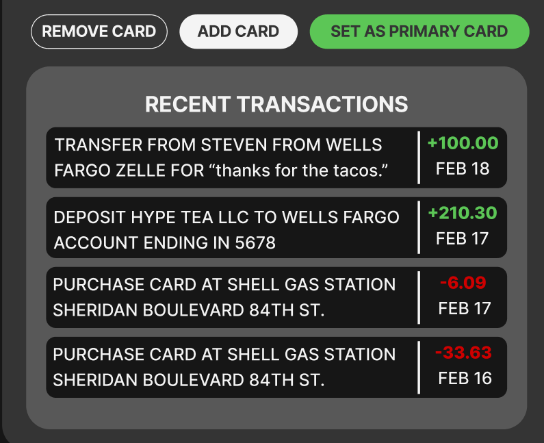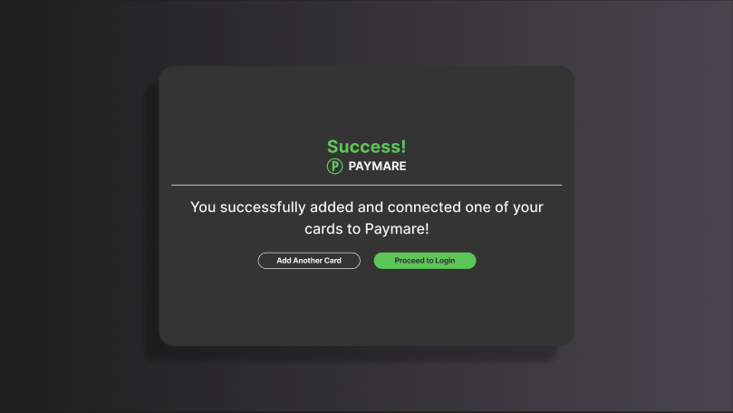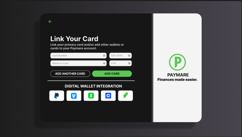 The second issue I wanted to change was the restrictive process of adding a card or connecting a digital wallet as a first time user. One of my test participants noted that they wish they could do the “add card” feature later in the process, rather than being forced to connect anything when first signing up. I believed that this was indicative of a more constraining process and may deter/annoy first time users. To fix this, I replaced the “add another card” feature with “set up later” so the user can just go straight to the dashboard rather than being forced to connect anything. I also decided to move the “add another card” feature to a confirmation screen after connecting an initial card to remove any unnecessary extra screens. I also integrated this concept into a new digital wallet confirmation/login screen which I did not have prior.